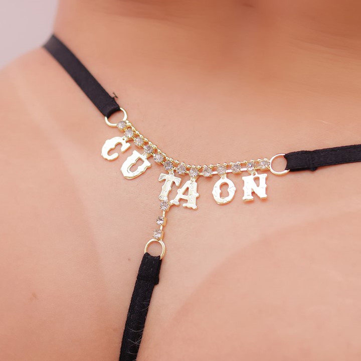Esquente o clima já com o visual e avisa o queridão que hoje o Cu ta On, com a Calcinha Fio Dental com Strass Frase "CU TA ON".